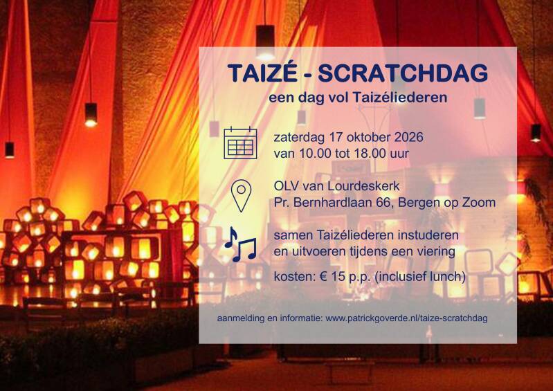 Jaarlijks organiseer ik één of twee Taizé-scratchdagen. Scratch komt van de Engelse uitdrukking "to start from scratch", oftewel "met niets beginnen". Tijdens een Taizé-scratchdag worden overdag gezamenlijk enkele (grotendeels meerstemmige) Taizéliederen ingestudeerd, zonder dat er eerder met elkaar gezongen is. Taizéliederen zijn korte meditatieve liederen die vele malen achter elkaar herhaaldelijk gezongen worden. Het zijn internationale liederen, dus er zal in meerdere verschillende talen worden gezongen. Iedereen kan meedoen, of je nu ervaren of beginnend zanger bent. Aan het einde van de dag zullen de Taizéliederen worden gezongen tijdens een eucharistieviering in de kerk. Dit is geen viering zoals deze in Taizé worden gehouden, maar een gewone eucharistieviering met Taizéliederen. Voor de liefhebbers is er ook een (niet verplichte) warming-up met oefenbestanden van de betreffende Taizéliederen mogelijk, om vooraf alvast thuis te oefenen.